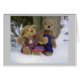 How romantic! A young teddy couple holding paws as they sit under a tree on a winter afternoon.