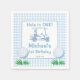 Hole in one golf themed 1st birthday party monogrammed printed napkins, pastel blue gingham handrawn sketch golf cart golf balls birthday party personalised napkins, golf birthday personalised table decor, boys 1st birthday party decor, first birthday party printed tableware