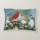 A collection of songbirds on a snow covered fence decorated with Christmas garland. Bird species include eastern bluebird, northern red cardinals, and black-capped chickadee. The fence is adorned with a Christmas garland made of pine branches, cones, and holly berries, accented with gold jingle bells and a bright red ribbon.