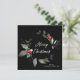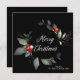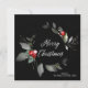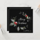 This modern beautiful square holiday card features elegant watercolor red holly berries with greenery and elegant golden twigs on black background with hand lettered white Merry Christmas text. The back of the card is a simple black to match the front.