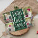Rustic and festive holiday photo card features four photos in a collage layout, with "faith, love, family" in white hand lettered typography on a handpainted hunter green and black buffalo plaid background. Personalize with your names beneath, and add an additional photo to the back on a red plaid patterned background.