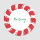 Easily personalise this Christmas name tag with your own custom text. It features a bold peppermint candy cane design by MISOOK. This name tag can add some Christmas holiday cheer to your event. Available with a pin back or magnetic (do not use with pacemaker) fastener. The round name tag is 3 inches. No minimum order quantity and no setup fee.