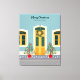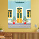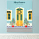 This festive and elegant Christmas illustration showcases a yellow façade of an old traditional Portuguese house adorned with wooden doors and windows and wrought iron balconies. Portuguese pavement graces the sidewalk, while two Christmas trees adorned with colourful Christmas balls stand by the entrance. A Christmas wreath graces the door. The scene captures the essence of the Portuguese Christmas in the streets—a harmonious blend of traditional architecture and joyful holiday spirit.