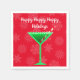 This colourful napkin will be a festive touch for your party. The napkin design is bright red with a green martini. The martini has a candy cane garnish and sugar on the rim. The background has pale snowflakes, and the text says Happy Happy Happy Holidays.