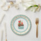 This paper plate features a holiday cupcake with a heart decoration on top. The border around the plate is blue and cream with gold snowflakes and a gold outside edge.
