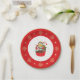 This paper plate features a holiday cupcake with a a candy cane decoration on top. The border around the plate is red with gold snowflakes and a gold outside edge.