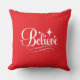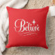 This holiday throw pillow is shown with a Believe print in a fancy script.