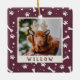 Give your furry friend a special place on the tree this Christmas with our festive pet photo ornament. Cute design features your favourite dog photo with your pet's name beneath, on a burgundy plum background dotted with pawprints and dog bones.