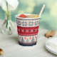 Cute Christmas paper cup featuring holiday themed knitting pattern, a deer silhouette, and script