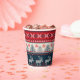Cute Christmas paper cup featuring holiday themed knitting pattern, a deer silhouette, and script