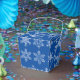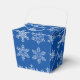 This Christmas holiday favour treat box is shown in a festive snowflakes print in colours of sapphire blue and white.