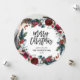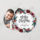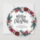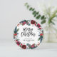 Affordable custom printed holiday photo cards with simple templates for customisation. This fun design features a circle die-cut shape with a burgundy and green watercolor floral wreath. The text reads "Merry Christmas" in a hand lettered brush script font. Personalise it with your family names, the year or other custom text. Reverse side has space for your photo or additional text. Use the design tools to edit the text, add more photos and create a unique one of a kind round Christmas photo card.