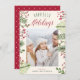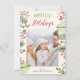 Festive holiday photo card features painted watercolor berries, leaves and branches, surrounding your favorite photo in the center. "Happiest Holidays" appears at the top in red and green hand lettered block and script typography. Personalize with your custom greeting and names at the bottom.