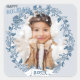 Lovely Christmas photo stickers. Festive blue wreath and ornaments theme with typography text. Year date can be customised by you. Replace this winter child photo template with your uploaded photo.. A Beautiful way to share a favourite photo this Holiday Season.