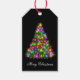 Holiday gift tag shown with a festive Christmas tree print on a black colour background.