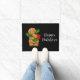 Holiday doormat shown with a black background with a cute gingerbread man happy holidays print.