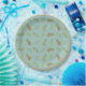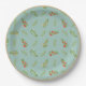 This paper plate features lots of Christmas greenery and berries on a blue background with a gold border.