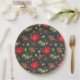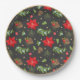 This paper plate features lots of Christmas greenery, poinsettias and pinecones on a black background with a gold border.