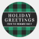 Square holiday sticker design features a custom Holiday Greetings message that can be personalised with your last name or family name. Text is framed by a classic green and black buffalo check plaid patterned background.