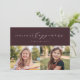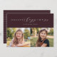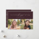 This elegant photo card features a Holiday Happiness type treatment in white against a rich plum wine background with two horizontal photos. The back is a coordinating striped wine colour. This holiday card is the perfect way to send greetings to family and friends.