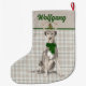 A festive holiday Christmas stocking has a watercolor illustration of a cute Irish Wolfhound wearing holiday antlers and winter scarf on a neutral toned plaid, with your pup's name on both sides.