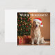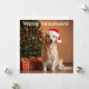A delightful Christmas greeting card featuring a charming golden retriever in a Santa hat, radiating holiday cheer as it sits beside a dazzling Christmas tree adorned with ornaments and lights. The wrapped presents add a festive touch, creating a heartwarming and whimsical scene.