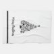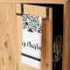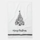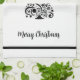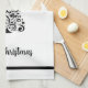 Holiday kitchen towel is shown in a festive Christmas tree print design in black and white.