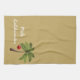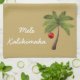 Kitchen towel shown in a festive holiday palm tree print. Mele Kalikimaka is Merry Christmas in Hawaiian in White text, towel is matte Gold.