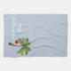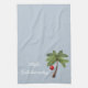 Kitchen towel shown in a festive holiday palm tree print. Mele Kalikimaka is Merry Christmas in Hawaiian in White text, towel is Blue Fog.