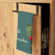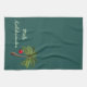 Kitchen towel shown in a festive holiday palm tree print. Mele Kalikimaka is Merry Christmas in Hawaiian in Sea Mist Green text, towel is Emerald Sea Green.