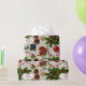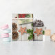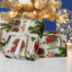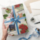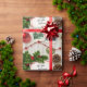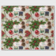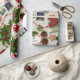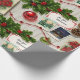 This delightful wrapping paper features a charming collage-style design with a nostalgic holiday theme, set against a light, weathered wood-grain background.