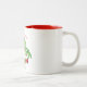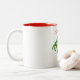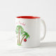 This coffee mug is shown with this cute green palm trees with a single ornament print. Greeting says "Feliz Navidad"