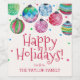 This holiday ornament christmas wine label makes the perfect festive holiday gift. The watercolor design features dangling colourful christmas baubles with red green and blue confetti. Personalise the label with your name.
