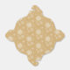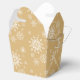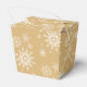 This holiday party favour box is shown in a festive Christmas holiday gold and white snowflakes print.