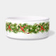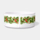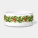 This large size pet bowl is shown with a festive holiday print of garland in fir and mistletoe with red ribbons.