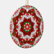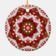 A red, white and green fractal art kaleidoscope decorates this Christmas tree ornament.