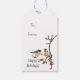 A delightful holiday gift tag featuring a few Blue Tit Birds resting on a snowy holly branch adorned with bright red berries.