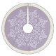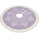 Holiday tree skirt shown in a sugared plum (light purple) colour with a snowflake print and coordinating border colour in ivory and matte gold colour.
