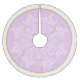 Holiday tree skirt shown in a warm orchid colour with a snowflake print and coordinating border colour in ivory and matte gold colour.