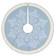 Holiday tree skirt shown in a antique blue colour with a snowflake print and coordinating border colour in ivory and matte gold-colour.