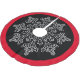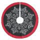 Holiday tree skirt shown in black colour with a snowflake print and coordinating border colour in red.