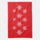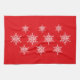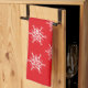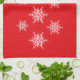 Holiday kitchen towel is shown with a festive snowflakes print.