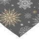 Holiday table runner is shown with a festive snowflakes print.