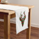 Holiday table runner is shown with a festive deer head print in a green and red plaid.