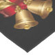 Holiday table runner is shown with a festive gold bells print design.