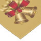 Holiday table runner is shown with a festive gold bells print design.