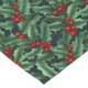 Holiday table runner is shown with a festive holiday holly print design.