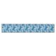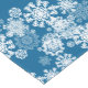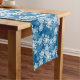 This Christmas holiday table runner is shown with a blue background colour and has a festive Christmas snowflakes print design.