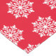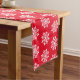 This Christmas holiday table runner is shown with a red background colour and has a festive Christmas snowflakes print design.