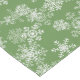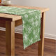 This Christmas holiday table runner is shown with a green colour background and has a festive Christmas snowflakes print design.